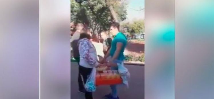 En la grabación se observa como un una mujer, quien presume ser empleada del Ayuntamiento de Guadalajara, intenta quitarle la mercancía al joven en repetidas ocasiones y con lujo de violencia, ante decenas de personas que le pedían que lo dejara trabajar.